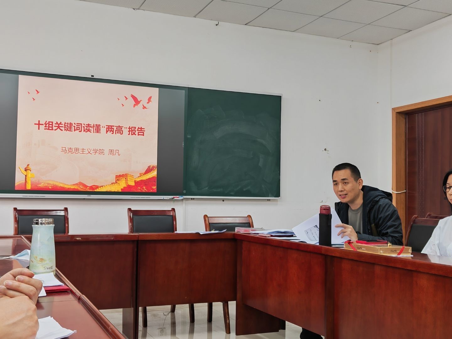 2022年3月10日下午,“概论”教研室党支部在学院楼309会议室召开支部党员大会,组织全体党员认真学习全国“两会”精神。蒋明伟同志结合《政府工作报告》中涉及未来一年国家发展的整体规划、目标方向及行动路线等方面内容谈了个人学习体会,周凡同志围绕《最高人民法院工作报告》《最高人民检察院工作报告》从维护疫情防控秩序、加强未成年人保护、以法弘德等引起人们广泛关注的热点法治问题交流了学习心得,全体党员踊跃发言,积极交流,在互学互评中进一步加深了对“两会”精神的领会和把握。