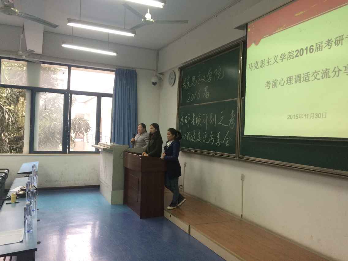 于弘德楼5401教室开展了考研专项提升计划之考前心理调适交流分享会。2011级优秀考研代表余维维、郝梅、张燕霞为主讲人,直播